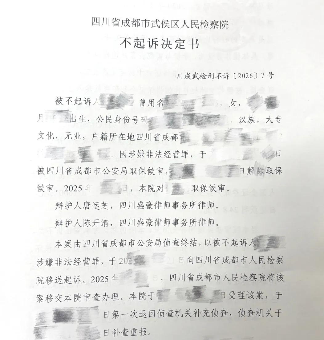 2026年1月21日,四川盛豪律师事务所刑事辩护领域再传捷报。由陈开清律师、唐运芝律师共同承办的一起涉嫌非法经营罪案件,于今日正式收到成都市武侯区人民检察院作出的不起诉决定书,当事人的合法权益得到有力维护。